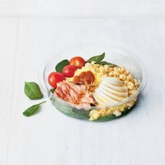 Kanaa, pekonia, tomaattia ja juustoa sekä salaattia (VL)